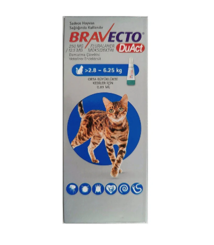 12 hafta boyunca anında ve kalıcı pire ( Ctenocephalides felis ) ve kene ( Ixodes ricinus ) öldürme aktivitesi sağlayan kedilerde kene ve pire enfestasyonlarının tedavisi için. Aktif maddeye maruz kalabilmek için pire ve keneler konağa tutunmalı ve beslenmeye başlamalıdır.